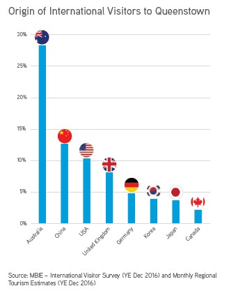 皇后镇是全球少有的四季皆宜的高端度假胜地,常年位居知名媒体评选的全球最佳旅游地,最美小镇,最友好城市前列;2016年全年接待游客约350万人次,年增长率达17.9%。皇后镇的国际游客主要来源于发达国家:30%为澳大利亚,中国游客约13%,其后依次为美国,英国,德国,日本等。这些高收入的客群支付能力非常强劲,2016年游客在皇后镇当地的消费金额达到了创纪录的21亿纽币。来自世界各地的游客将不同的文化和精彩同时也带到了这里,让这个本就惊艳的地方更加风情万种,雅致惬意。根据皇后镇政府的规划预测,保守估计至2023年接待国际游客数量将超过490万人次,较目前增长40%以上。